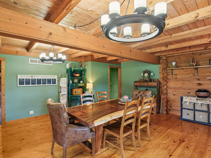 The centerpiece of this estate is a custom-built log home that blends rustic charm with refined sophistication. Inside, 5 spacious bedrooms and 5 full bathrooms provide comfort and privacy for family and guests alike. Vaulted ceilings, rich wood beams, and expansive windows frame breathtaking views in every direction, bringing the outdoors in.